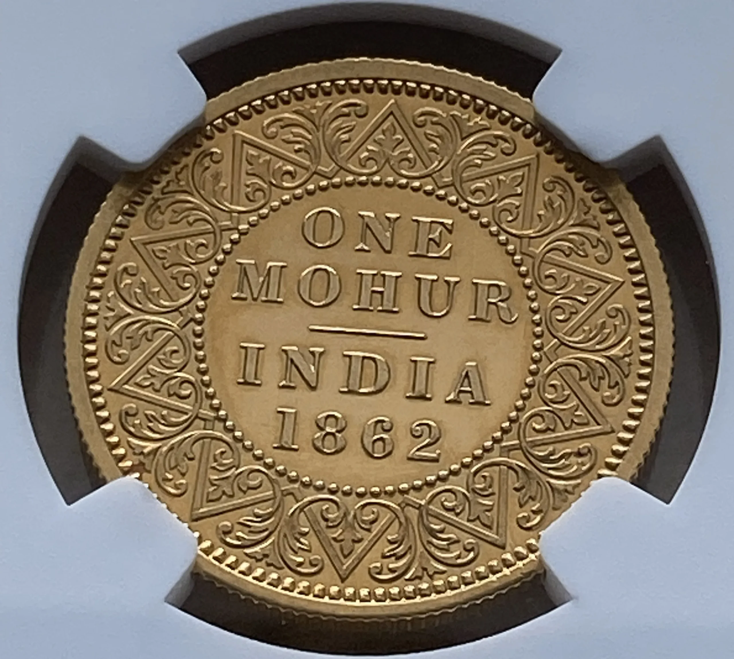 こちらは、インド 1862(C)年 RESTRIKE モハール金貨 PF62 NGC になります。