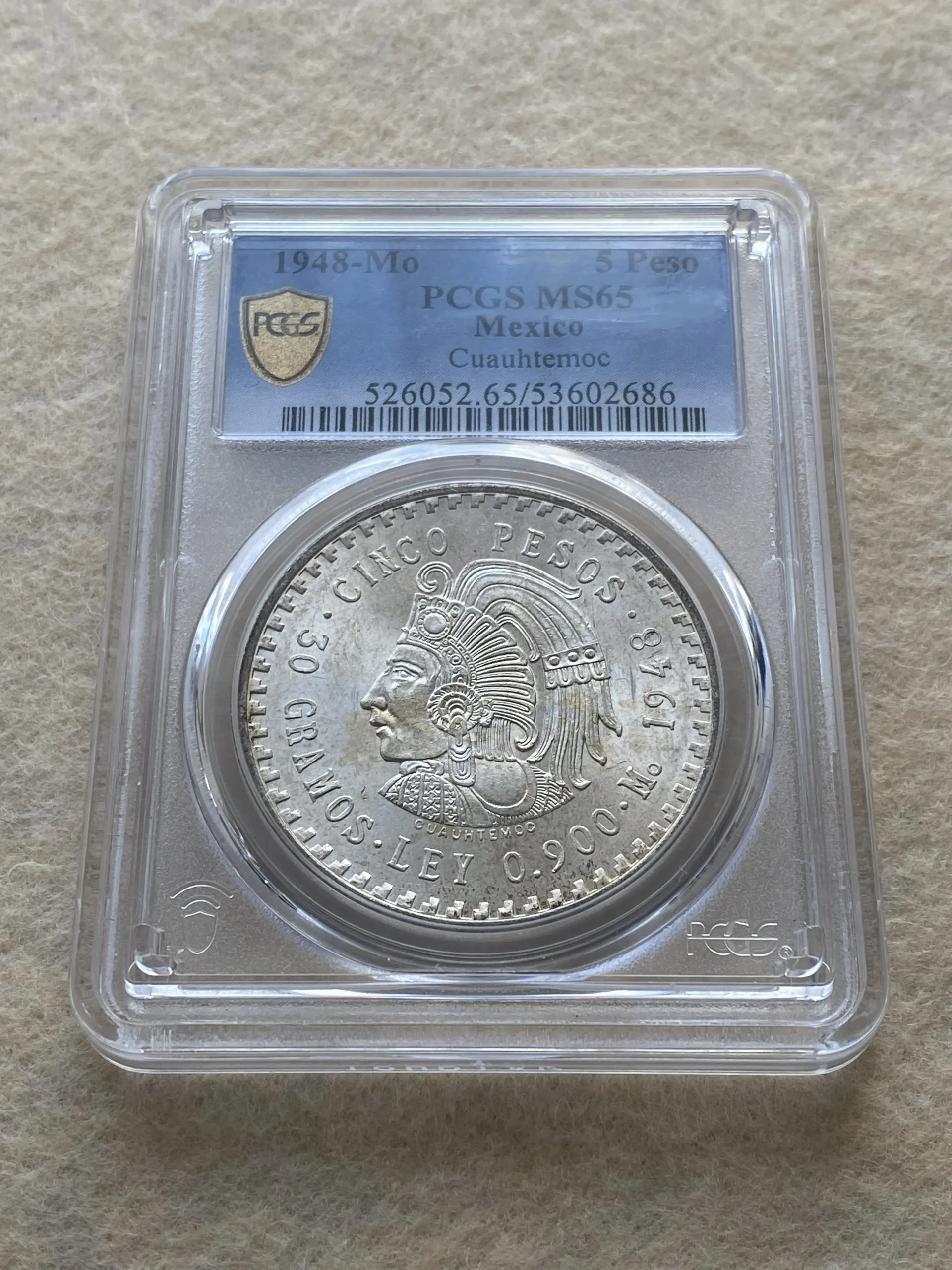 1948年 メキシコ 5ペソ銀貨 アステカ クアウテモック王 MS65 高鑑定品 PCGS!