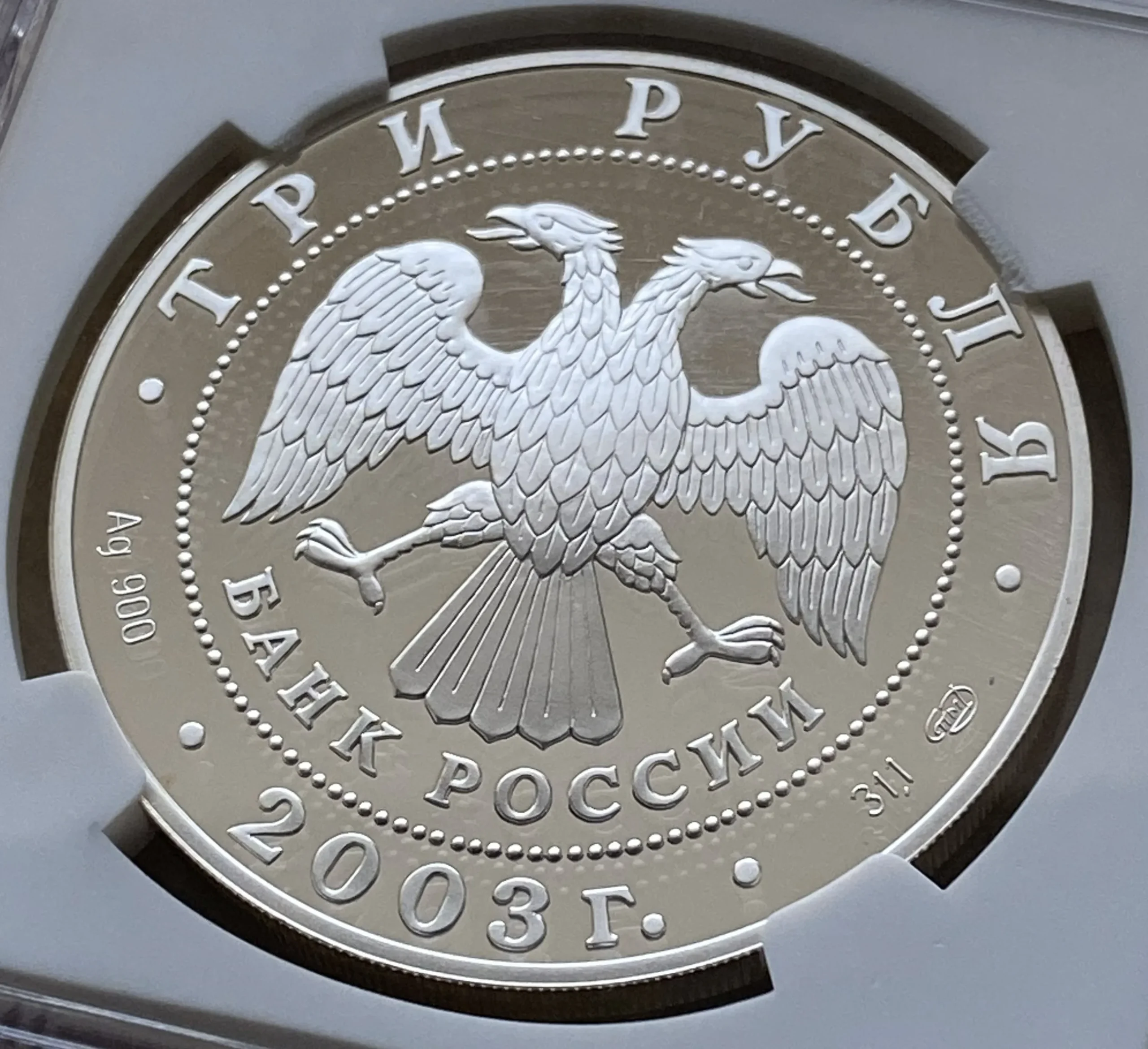 中央にはロシア銀行の紋章(翼を下に向けた双頭の鷲、その下部には半円形の碑文「БАНК РОССИИ(ロシア銀行)」)があり、その周囲には円状の点と碑文が描かれています。上部には「ТРИ РУБЛЯ(3ルーブル)」、下部には発行年「2003」が刻まれています。