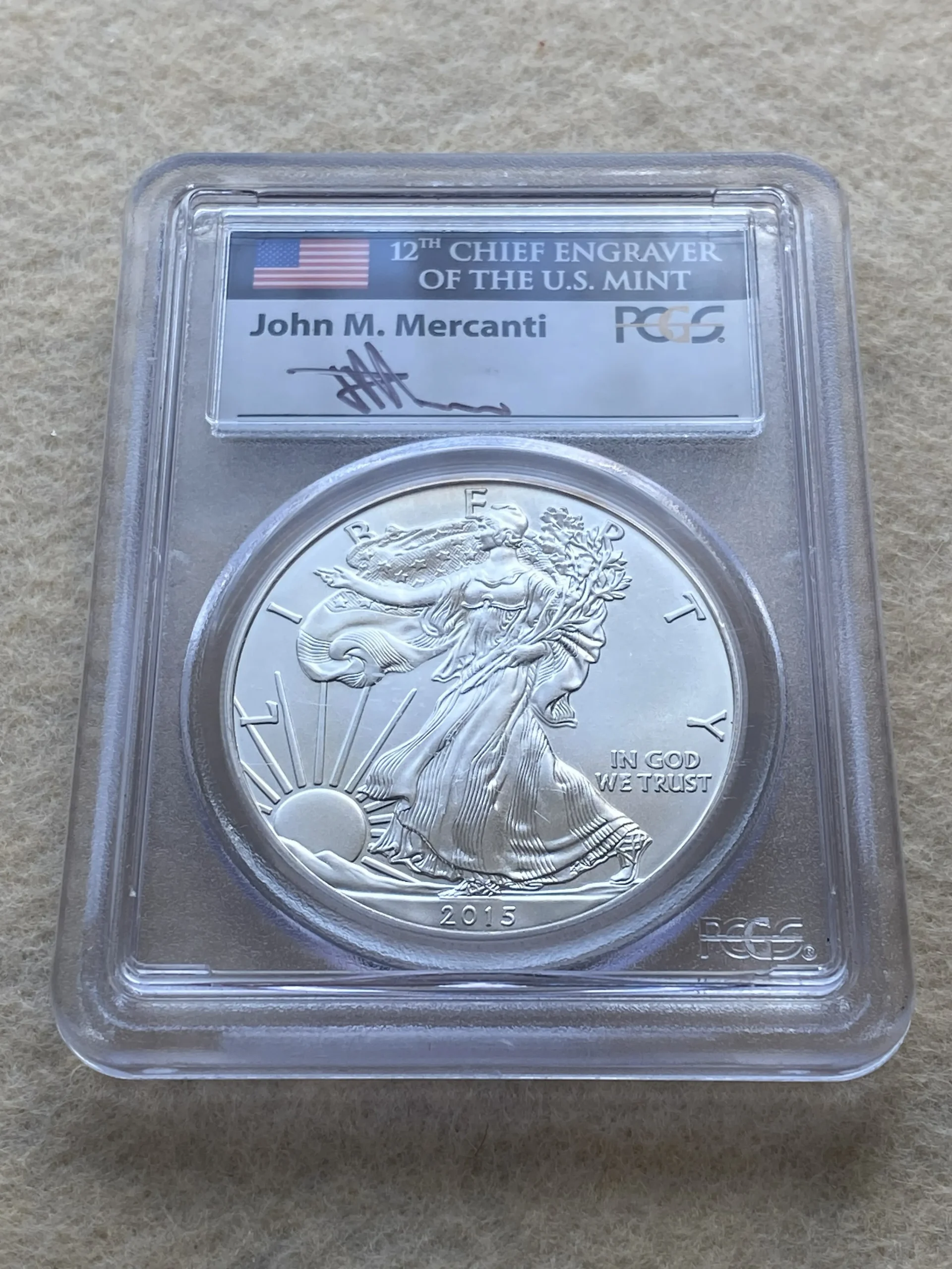 PCGS社にて、MS70かつファーストリリース(初期鑑定)の堂々最高鑑定品になります。 またこちらは、ジョン.M.マーカンティ ハンドサイン入りラベルでより希少性があります。 ジョン.M.マーカンティ氏はアメリカ造幣局の12番目の彫刻家で、2006年にアメリカ造幣局の最高彫刻家(デザインマスター・ツーリング開発スペシャリスト)に任命されました。 ハンドサイン入りラベルに収められるのは、枚数限定で、PCGSとコネクションのある数社のディーラーが手にすることができ、それらがまわり回って購入することができるようになります。