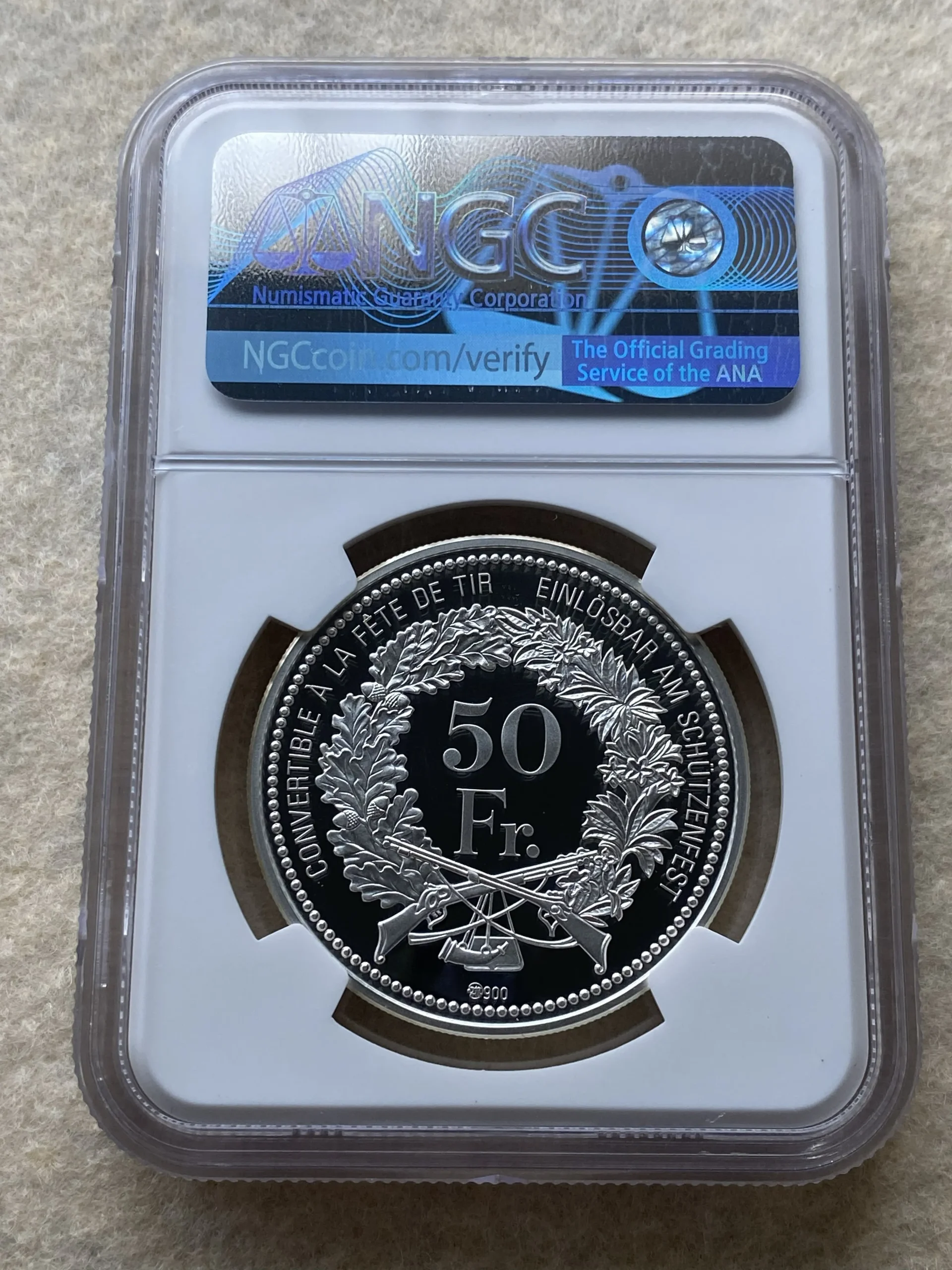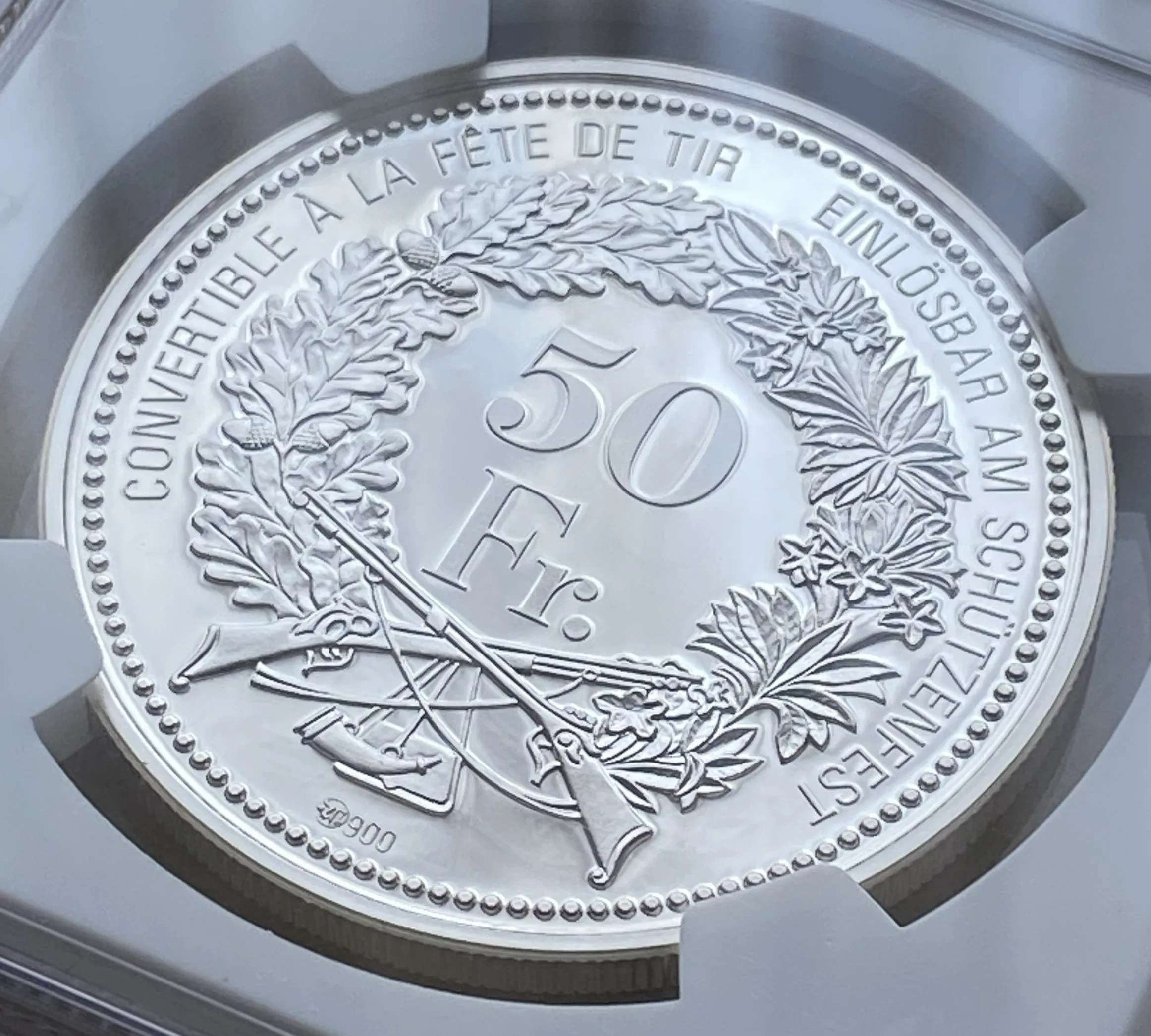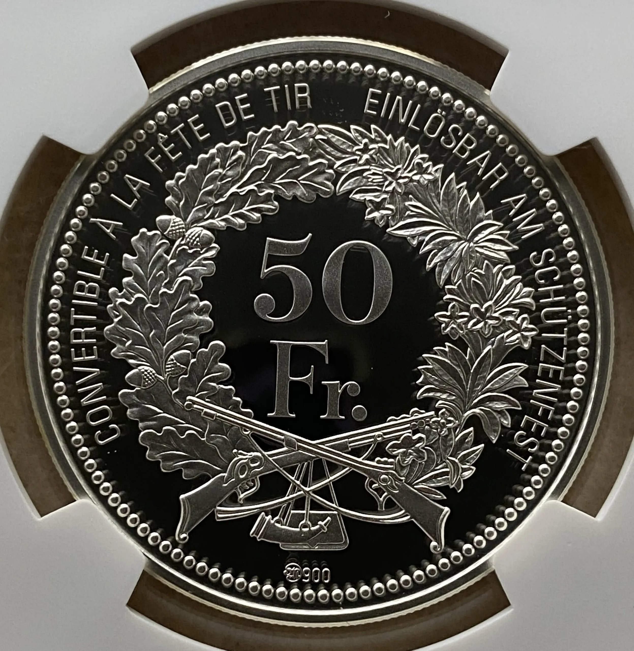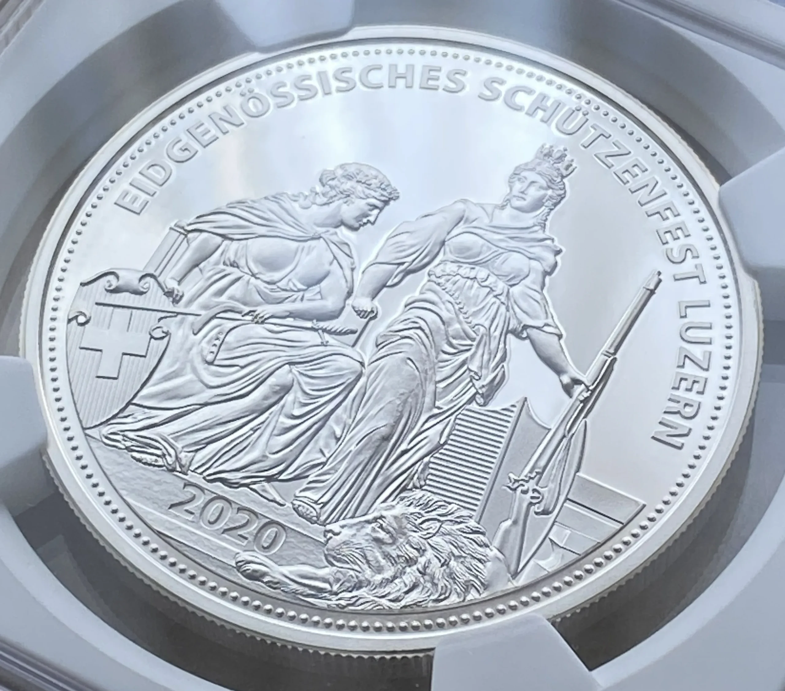 2020年スイス現代射撃50フラン銀貨 ルツェルン州 射撃祭特製ラベルの、堂々最高鑑定品を、是非投資やコレクションにご検討下さい!