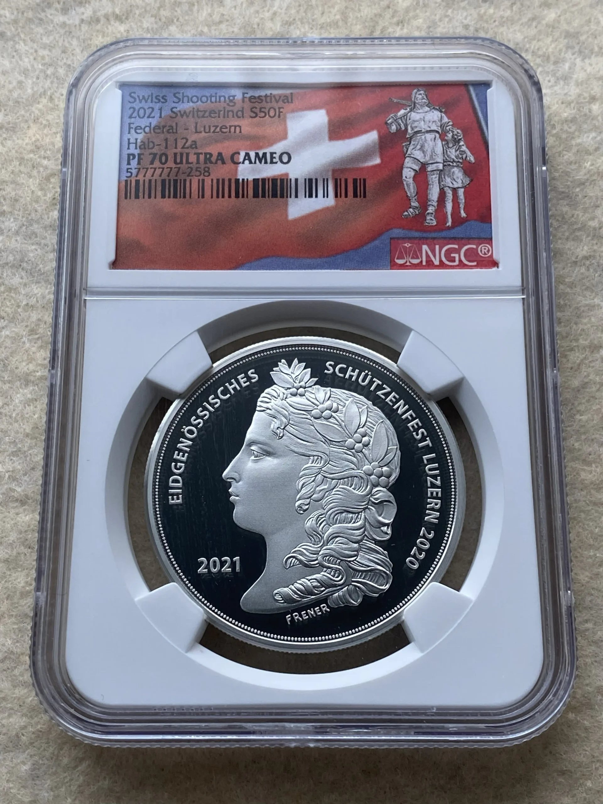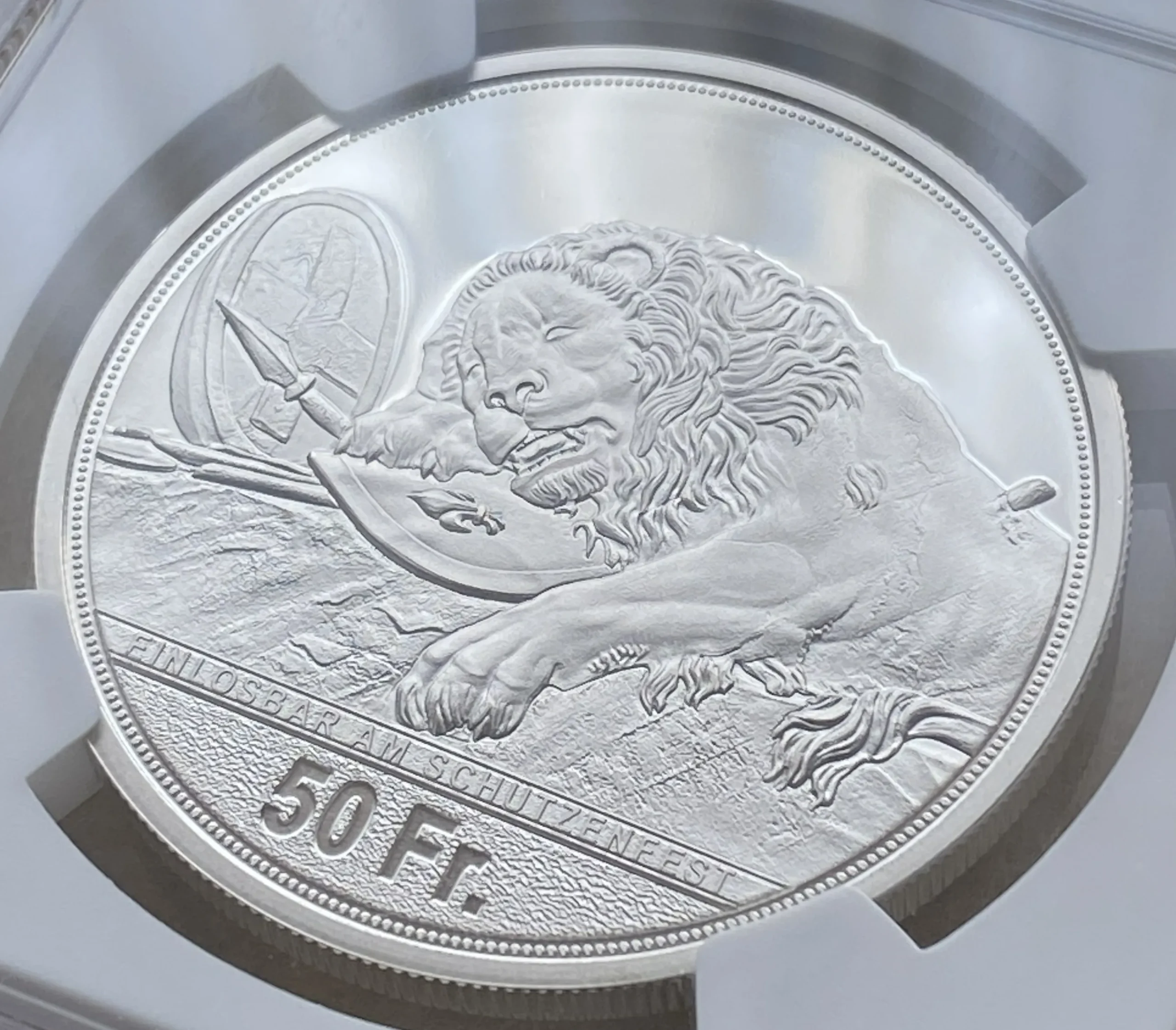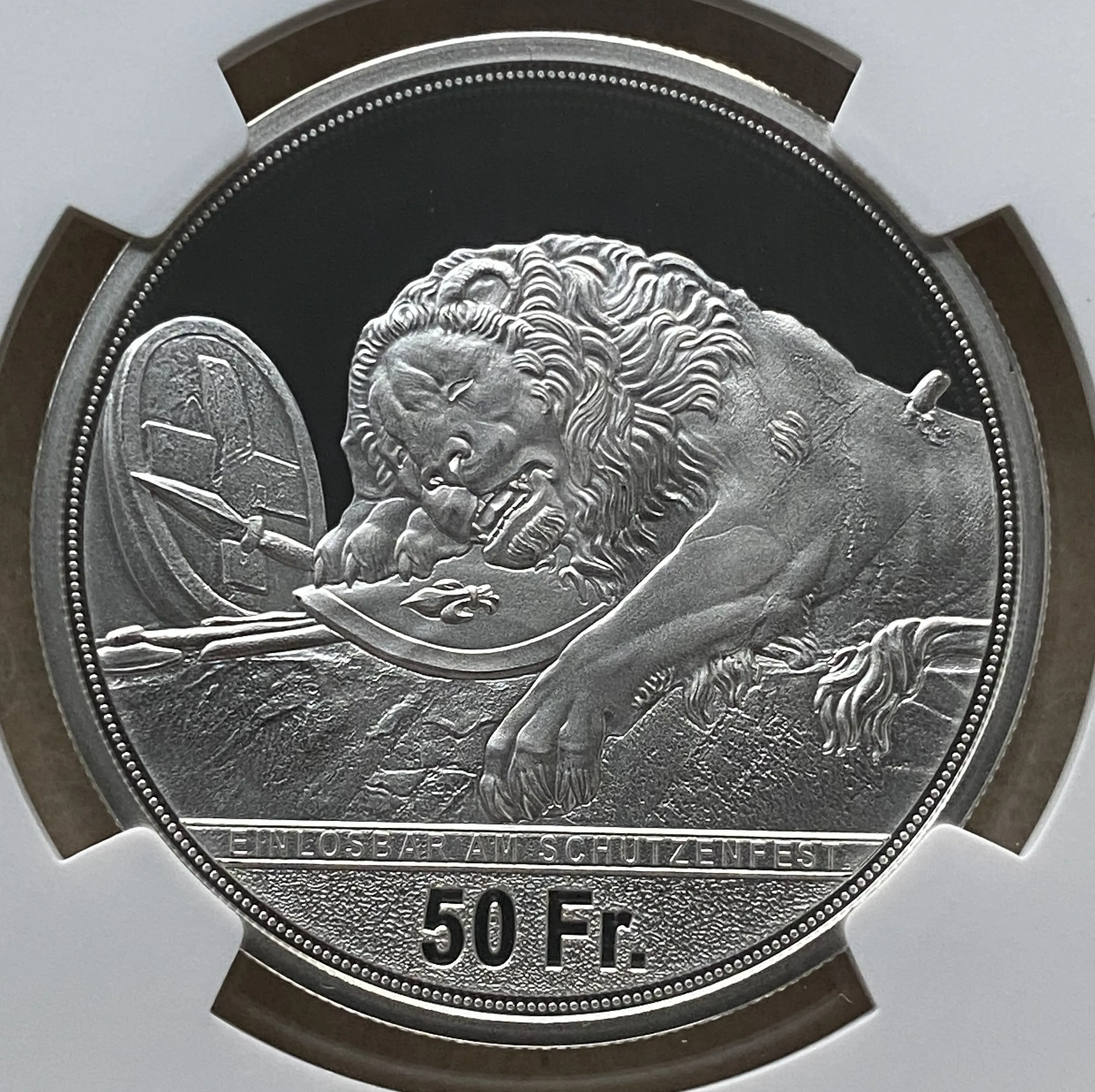 2021年スイス現代射撃50フラン銀貨 ルツェルン州 射撃祭特製ラベルの、堂々最高鑑定品を、是非投資やコレクションにご検討下さい!