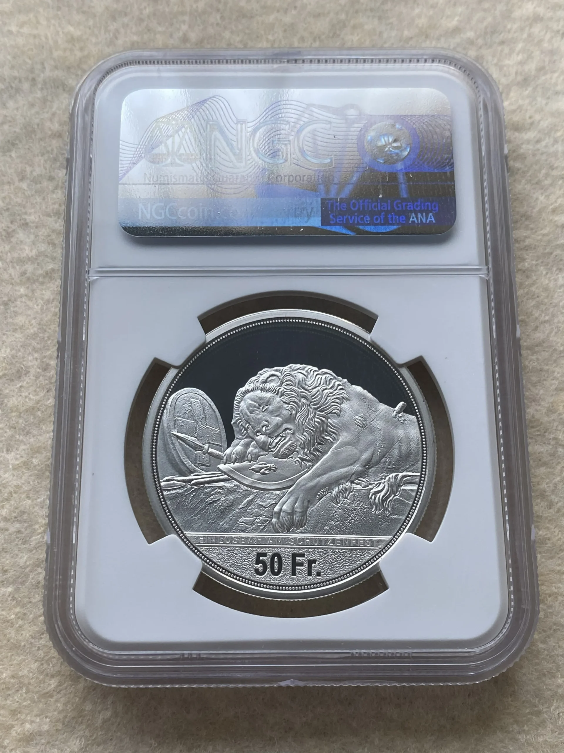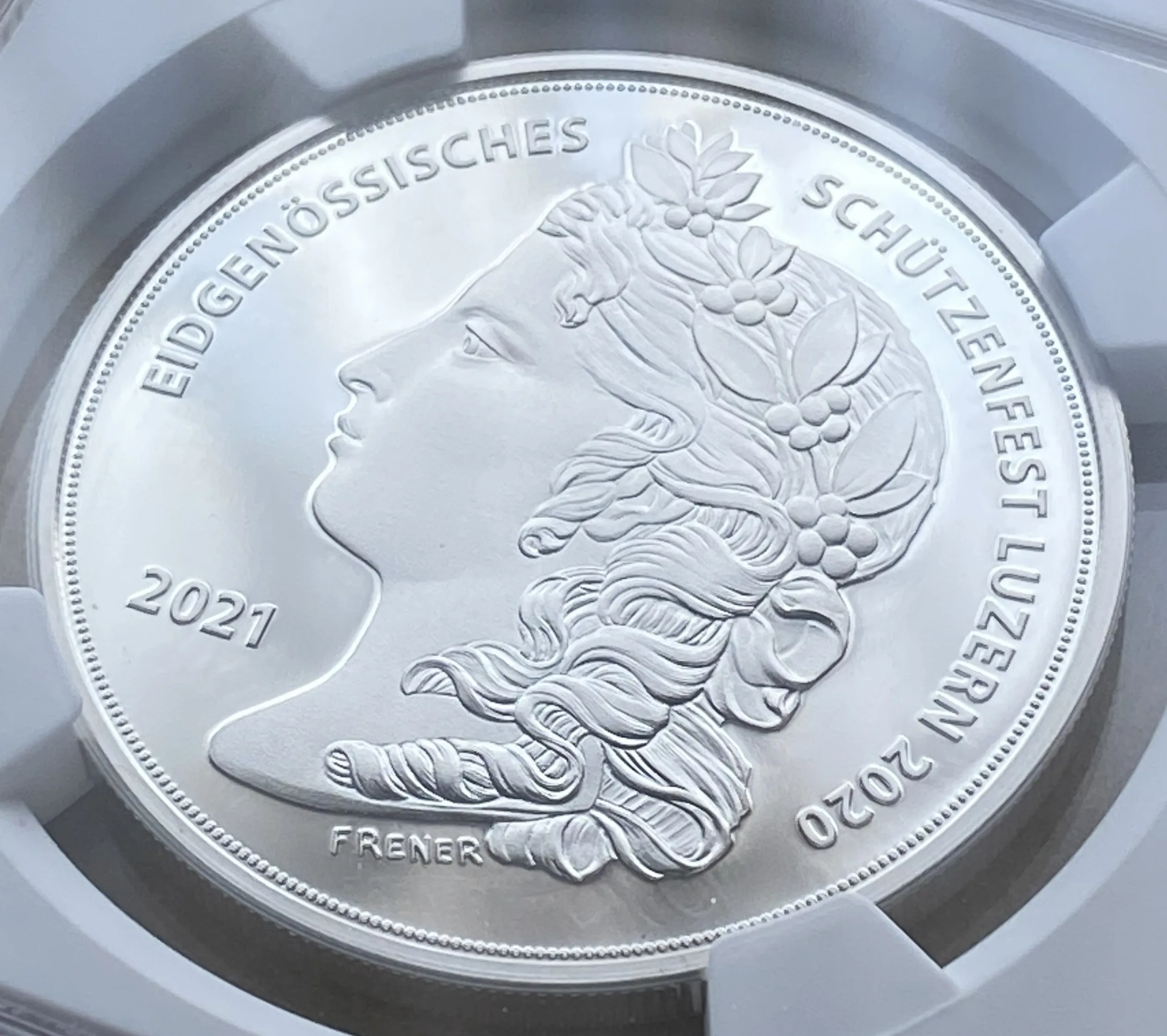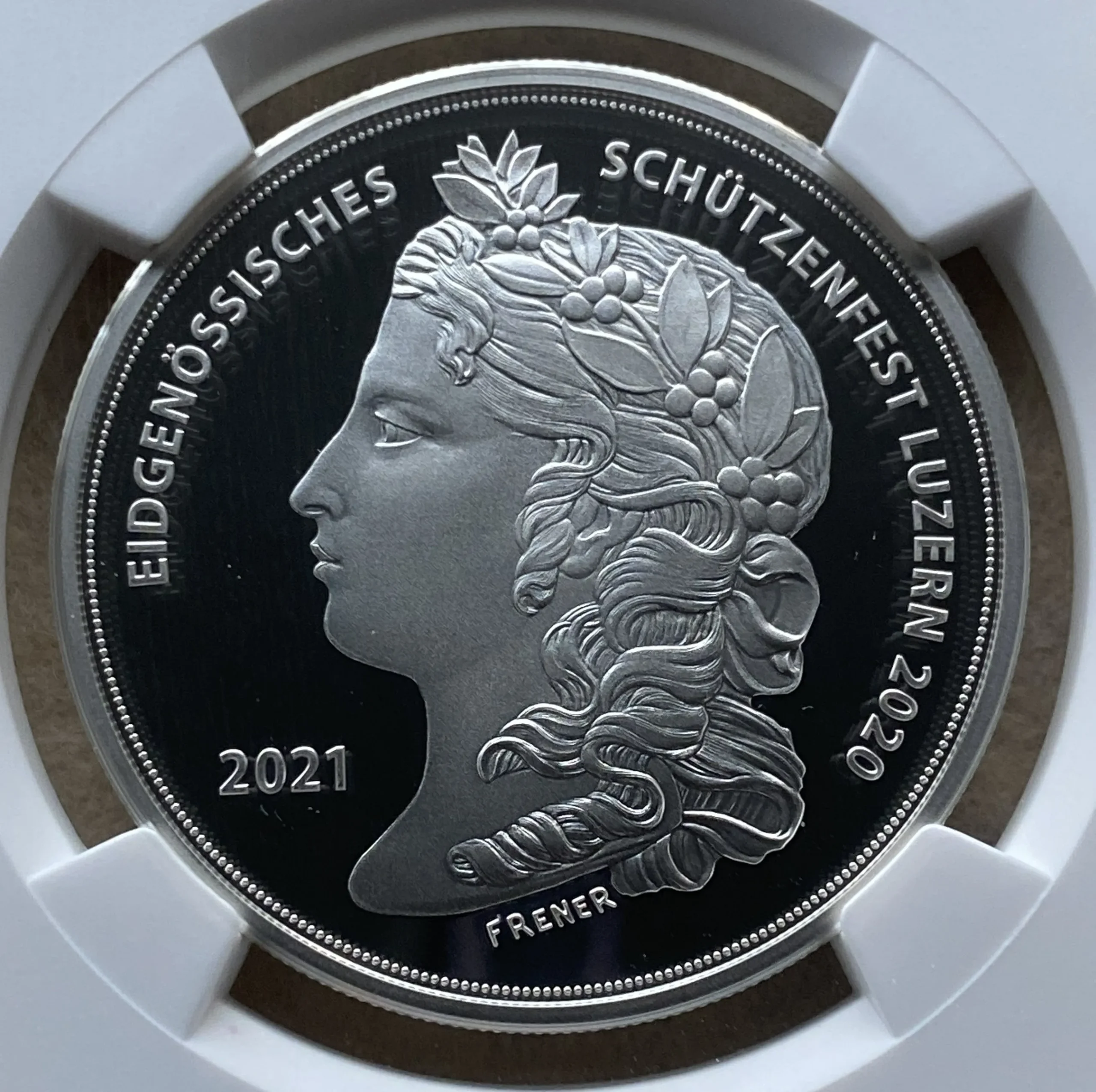 2021年スイス現代射撃50フラン銀貨 ルツェルン州 射撃祭特製ラベルの、堂々最高鑑定品を、是非投資やコレクションにご検討下さい!